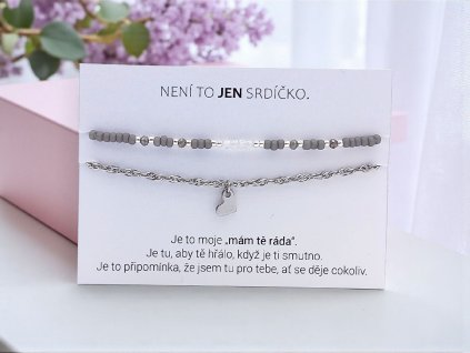 Dvojice náramků v příjemných tónech a symbolickým srdcem. Souprava obsahuje - 2 náramky na kvalitní pružence, kartičku a dárkovou krabičku.