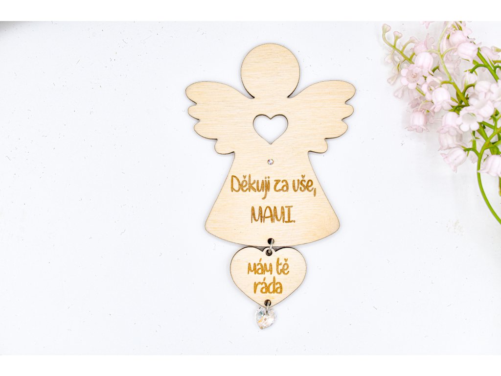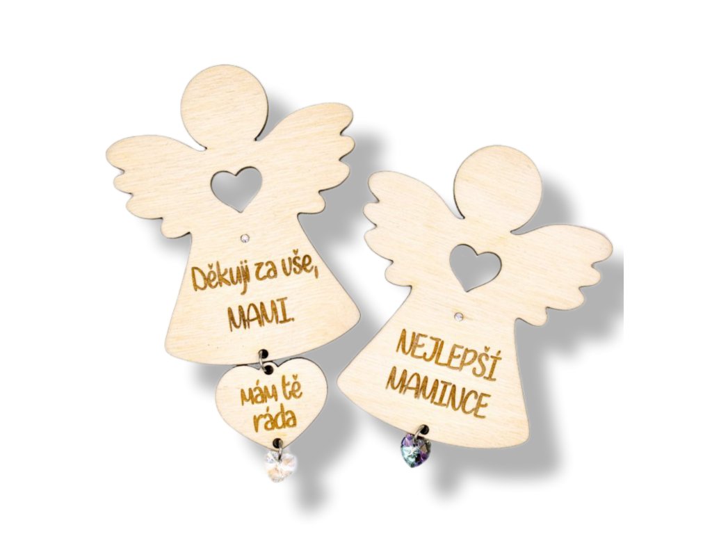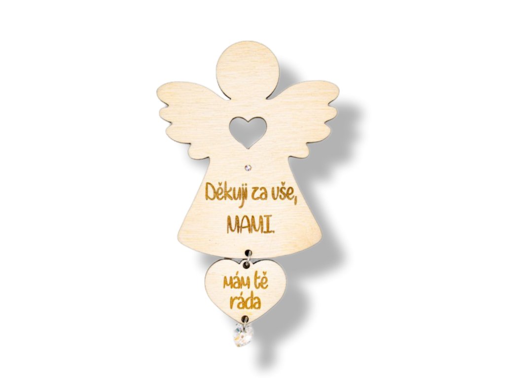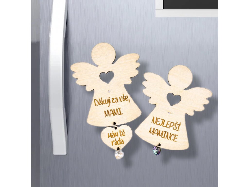 Dřevěná magnetka ve tvaru anděla na ledničku - na výběr dva texty.Možnost přidat k němu dřevěné srdíčko s textem dle výběru a srdíčko Swarovski.