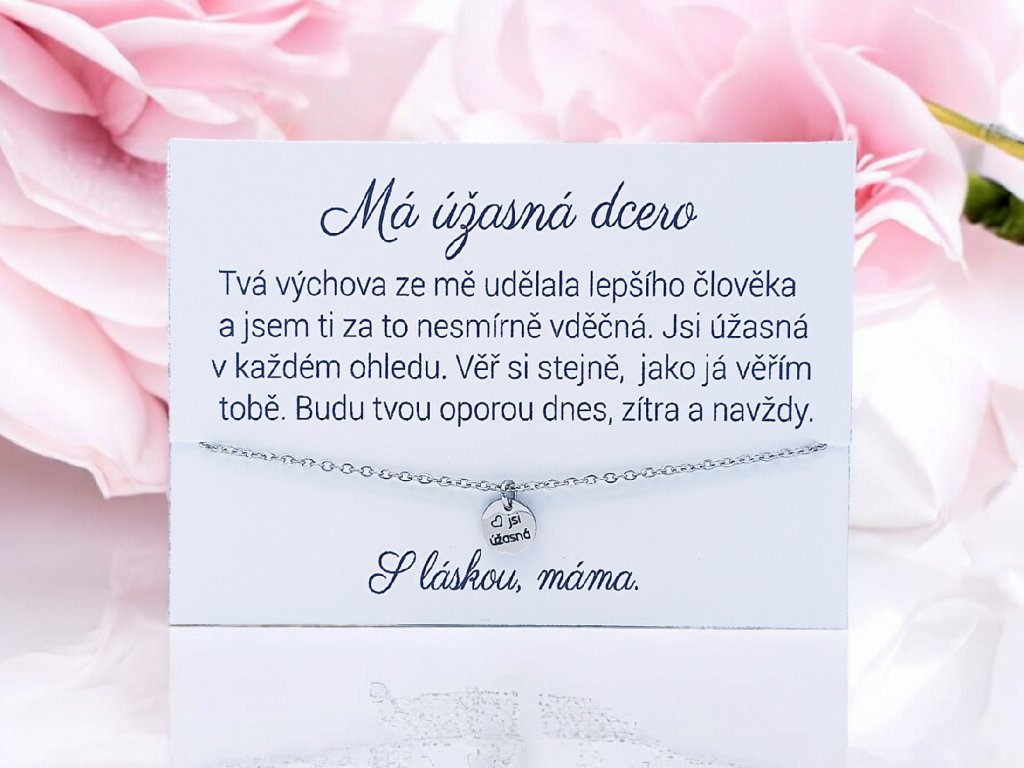 - Kartička s vřelým vzkazem: Součástí balení je kartička s textem, který vaší dceři připomene, jak moc je pro vás výjimečná a že ji vždy podpoříte.