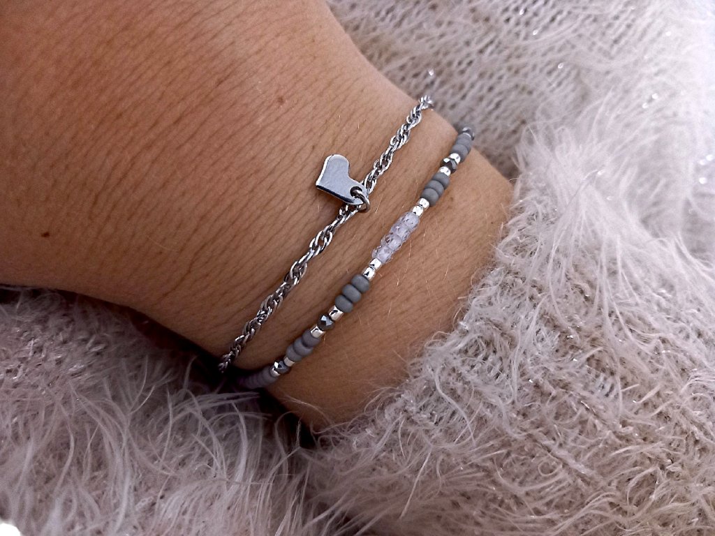 - Kombinace lesklé oceli a šedých korálků působí elegantně.